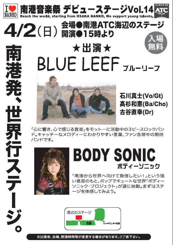 【2006年4月2日】 公開日 : 2006年4月2日 / 更新日 : 2019年4月11日 お知らせ 【2006年4月2日】 大阪南港アーティストフェス BODYSONIC 南港デビュー 入場 13:00 開演 15:00 ATCのサイトはこちら 「【2006年4月13日~16日】」 「【2006年4月01日】」